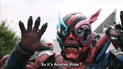 I was quite happy with this episode, all of my problems I had with the first episode were all gone. The characters weren't as one dimensional, actually, they've come a long way in just one episode as they are enjoyable and quite interesting. I am enjoying how the baddies have the powers of the Kamen Riders a lot more in this episode, sure, I liked this element in episode one but the concept has kicked into full gear in this episode and has become a much more fuller gimmick with a lot that they can do. I especially like that how the real Kamen Riders also have more at stake than simply just fighting an evil doppelganger, gives this concept a real fresh approach... Unlike that in that special 25th Anniversary Power Rangers episode where they were fighting cheesy robot clones. This Kamen Rider season takes the extra step of having our heroes fight people that have been corrupted instead of artificial creations. Now, I'm not saying that episode of Power Rangers was bad, I'm just saying that the evil robot clones in that episode were cheesy and not very threatening.
