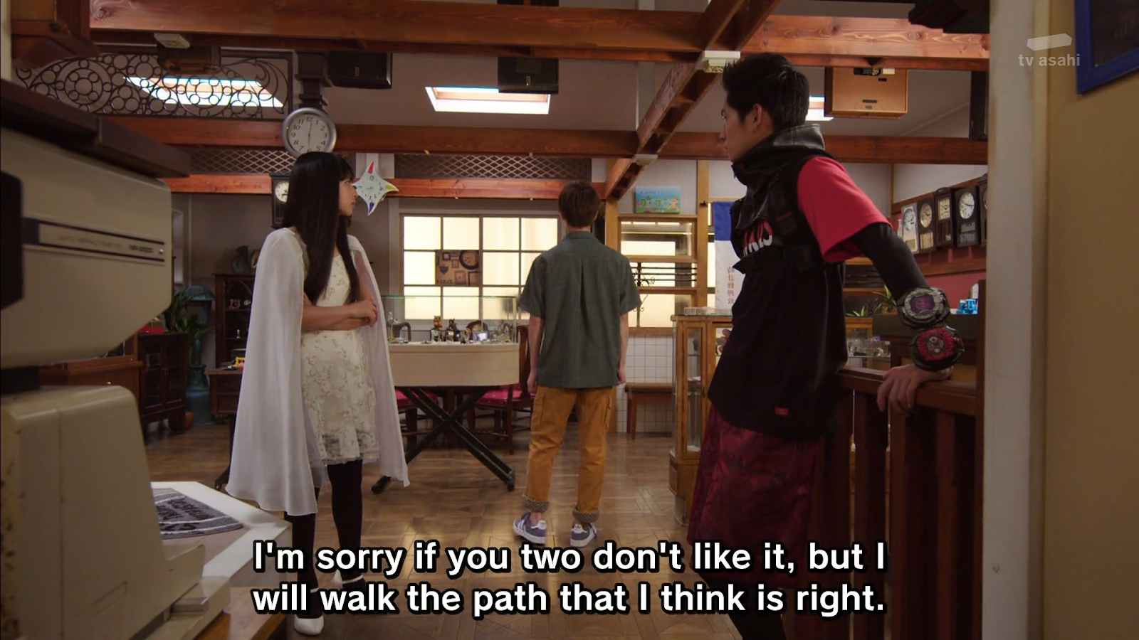 Our heroes have a meeting at home base, where they discuss how to get M back to his normal self. Geiz wastes no time and decides to go back to the year, 2016, where he'll put a stop to Evil Kamen Rider EX-Aid. Sougo and Tsukuyomi just let him be and they continue on coming up with plans. Once Geiz is gone, Tsukuyomi tells Sougo about Geiz's fight to save his friends during Future Sougo's evil reign and how it has been a very tough battle for him. Tsukuyomi also reveals that her plan is to try to save the future by getting Sougo on to the path of being good, therefore being able to save everyone. I quite like that plan and I hope it works out as I like the good version of Sougo over the evil one.