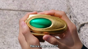 A magic bracelet that allows super fast running speed. Why does it look like a Chrono Changer? Because it was made from the same mold. Regardless of circumstances, the Gangler tries to get it back only for the Patrangers to show up leading to the typical 3-way battle. However, Yuuki runs off with the treasure leading Tooma to give chase. Without his treasure, the Lupinrangers lose interest in the Gangler and he escapes.