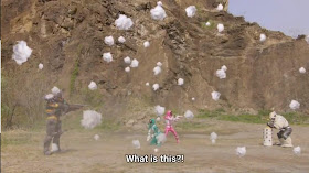 Things get right into the action from here. The Patranger's car gets stopped by someone being chased by Togeno so they henshin up and get into a shootout. Why doesn't this feel right? The fight doesn't last long, out of nowhere the Patrangers starting hearing an echoing voice taunting them but cannot find who is doing it. Togeno runs off and it turns out he was chasing this random guy because he found a VS vehicle on the ground that appears to be a drill.