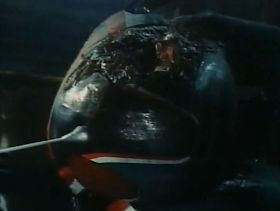 It's henshin a-go-go time again, baby! Kotaro transforms into Kamen Rider, in a transformation scene that's slightly different than usual, his face turns green, like the Hulk and then morphs into you know who. Kamen Rider gets the upper hand, he chops off Lord Rhino's horn but Lord Rhino won't stop and keeps on charging at him. Kamen Rider jumps on top of a crane but Lord Rhino bashes into it so much that Kamen Rider falls off and gets trapped under a lot of steel. Kamen Rider shakes it off but Lord Rhino has got him where he wants him but not for too long as Battle Hopper comes in and hits Lord Rhino. Kamen Rider rides Battle Hopper and runs Lord Rhino over again, then does his signature Rider Kick and Lord Rhino is dead... Talk about a gory fight *ba dum tish*.