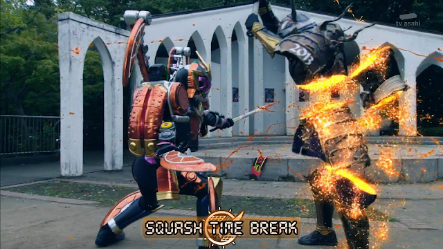 One of the Sougo's (I've lost track of them now) travels back to 2013 and morphs into Zi-O. This is where both Zi-O's power up into Gaim Mode, do the SGT. Kabukiman NYPD dance, fight both Evil Gaims, and then slice them both to pieces (literally). All of the missing boy band members are saved, Geiz is back on the team, and every thing is back to normal. Heck! We get a surprise plot twist! Geiz remembers to bring some chicken back home with him. Well, that wraps up the case of Sougo's Uncle wants chicken, a case that started a few episodes back.