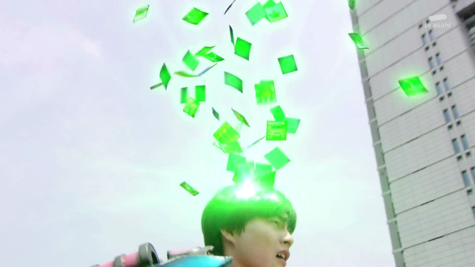 Keiichiro rushes to save a civilian from a Porterman attack and fights them unmorphed. Pretty convinient there happen to be trouble when he decided to storm off. He is holding his own but freezes when he sees his VS changer.