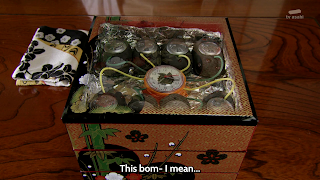 Once irritation levels are at a max, Tooma attempts to quit but the Sensei says he cannot, using another spell on Tooma. Are we seriously not supposed to pick up on what is going on? A few scenes later, the Sensei orders Sakuya to deliver a case of bombs disguised as sweets to the Global Police after receiving a mysterious phone call. Will somebody just say it already?