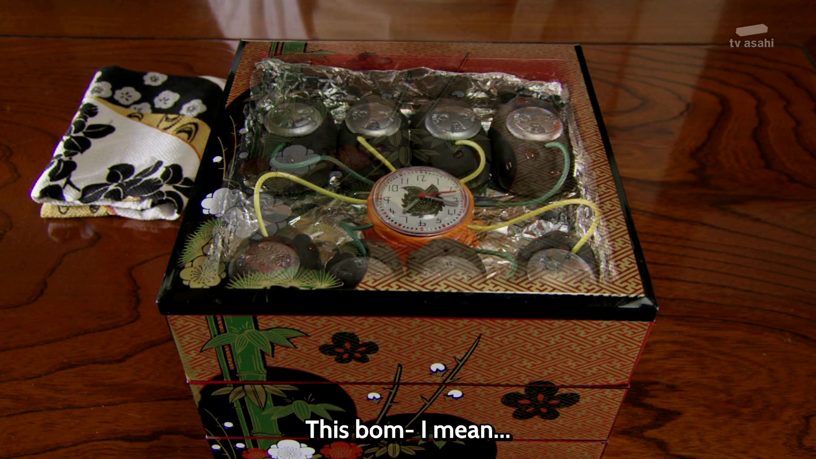 Once irritation levels are at a max, Tooma attempts to quit but the Sensei says he cannot, using another spell on Tooma. Are we seriously not supposed to pick up on what is going on? A few scenes later, the Sensei orders Sakuya to deliver a case of bombs disguised as sweets to the Global Police after receiving a mysterious phone call. Will somebody just say it already?