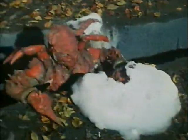 Kotaro is getting sick of this and now it's henshin time once more. Kotaro transforms into Kamen Rider and he dodges all of Crab Man's attacks. Crab Man crashes into some oil drums and Kamen Rider uses them to start a fire to trap Crab Man.  Kamen Rider finishes Crab Man off with his new and improved Rider Punch and Rider Kick.  Kamen Rider rescues Taichi and the mothers (that sounds like a band name), then he burn up all of Crab Man's babies.  The end.
