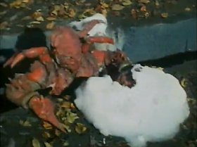 Now, back to the action. A lot of repetitive grabbing going on in this episode but there's also quite a bunch of crazy s**t going on too. You've got the scene where Crab Man throws a baby half-way across the street, which is very shocking to see on television. I also couldn't help but to laugh, it was overly ridiculous beyond belief. You've also got the dog rescue scene and my question is what on Earth was a puppy dog doing being up all the way on top of a mountain? It's like watching that scene from The Toxic Avenger, where Toxie rescues a baby from a tree. Actually, a lot of the crazy stuff in this is what I'd expect to see in a Troma move. I know Japanese superhero shows can get pretty crazy but this sends the crazy meter to the insane asylum. It was also bloody entertaining, that's for sure.