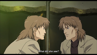 We learn in the next scene that one of the people we saw in the previous scene was the Minister's private secretary and her brain was damaged in the scuffle. She was there for Kubota conducting a secret investigation of the Minister. His activities have shown that he had taken interest in something called the "Ichinose Report", something to do with diplomatic and military strategic scenarios during states of emergency... Aka, something something plot related. Apparently, they wouldn't be able to refuse if the military received a disclosure request... But they haven't. So they've been watching him instead. He's been clean on the surface but something darker is afoot. It's up to Motoko and the gang to find out what really happened in that restaurant. A quick couple banters between Motoko, Batou, and Togusa pass us by and Aramaki is met in a park by another character who tells him to disregard things? I'm not sure what's going on here entirely. He's met with Motoko in a vehicle with surveillance footage from the restaurant, some of it bothering the major.