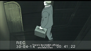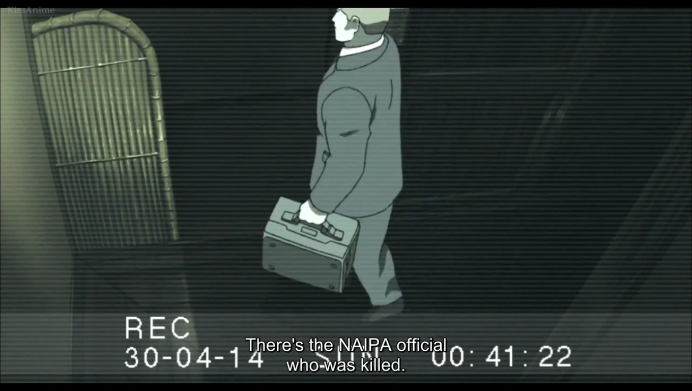 What I assume is one of the North American Industrial Promotion Alliance guys is shown to not have a correctly fitting spinal column. The Minister goes into the restroom with a geshia. He's weird and likes to swap bodies with them when he's drunk? Yikes. The not dead at the time NAIPA dude follows behind them into the bathroom with a suitcase... A suitcase that the Minister picked up earlier in the episode after the dust had cleared. The secretary comes to the bathroom, worried, only to stumble out and be attacked from behind by a geshia. The footage hard cuts then we see the secretary on the ground.