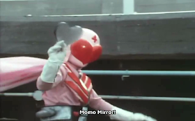 So, yellow gets nothing and pink gets a stupid little heart-shaped mirror? Not even with powers, all it does is glare a light in the enemies eyes. Can it get any lamer? For the finishing move, they used the Gorenger storm where they all passed a soccer ball around and kicked it onto Golden Mask's head which made him explode. It got lamer. This is before giant battles.