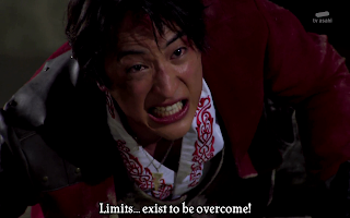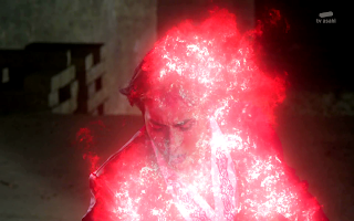Koh proceeds to take out a bunch of Drunn Soldiers with his now powered up form in a pretty cool fight scene. Then, he busts out another TyuyoSoul, this time a red one. This season really wants to get all of this establishment out of the way as fast as possible. The red Tysuyo Soul creates his finishing move that wipes out the remaining Drunn Soliders in one big triangle shaped explosion. Was actually a pretty cool effect that wasn't ALL CG this time.