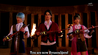 The episode ends on a serious note. Our elder mentor figure (whose name still hasn't been said) appears and tell the three rangers that their powers living on even without the temple and that there is a green and black Ryusoulger out there that they need to join up with. All three current Ryusoulgers remember that their masters souls are now inside their TyuyoSoul and they do the first group henshin/roll-call ending the episode.