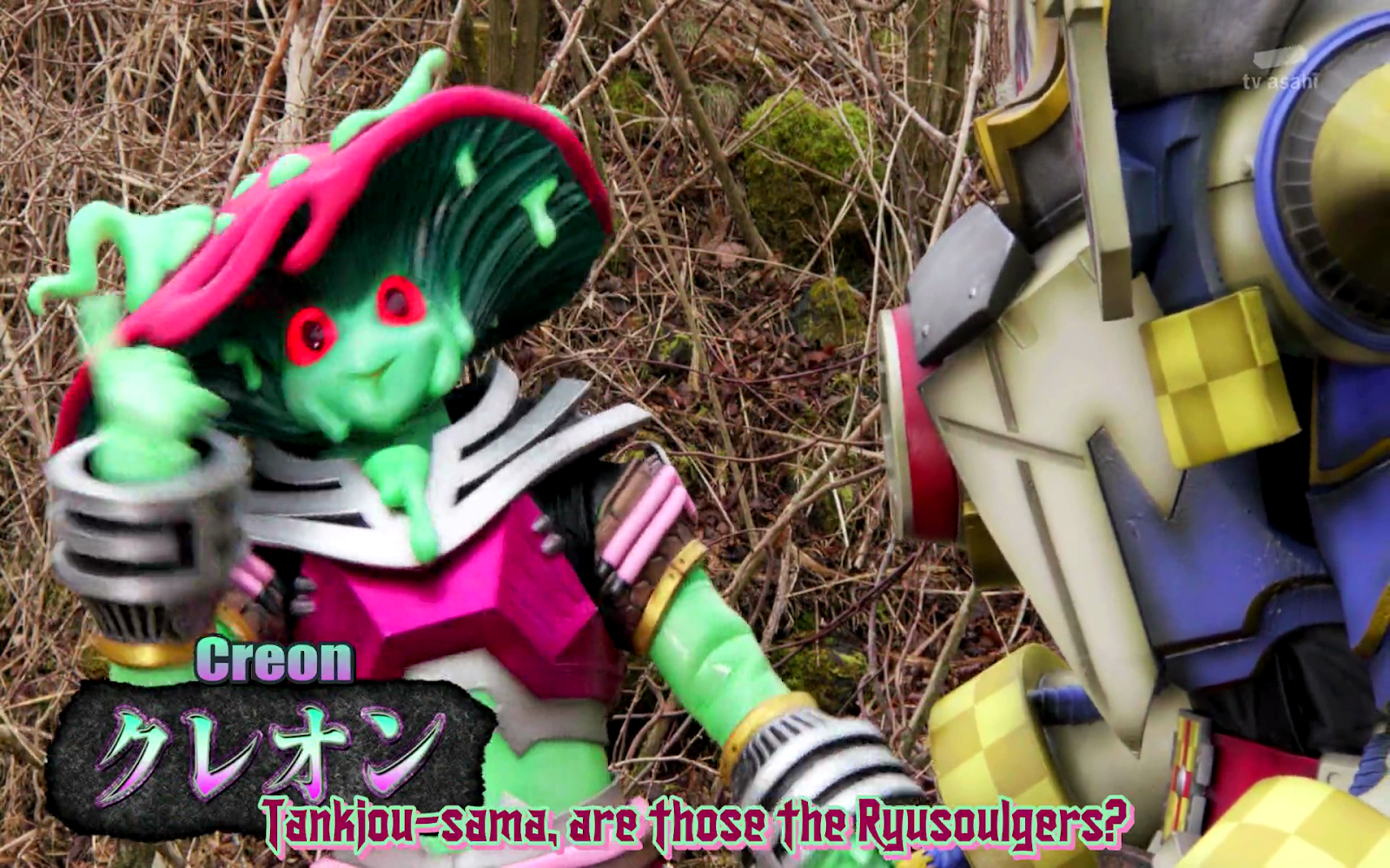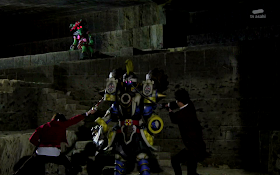 Back at full strength and full of rage, Koh henshins, attacks Tankjou and overpowers him. Looks like a victory for red, until something from space blasts the temple, making it start to collapse, and causes Tanjou to retreat but not before swearing the Druidon will win.