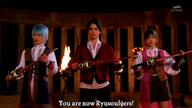 The episode ends on a serious note. Our elder mentor figure (whose name still hasn't been said) appears and tell the three rangers that their powers living on even without the temple and that there is a green and black Ryusoulger out there that they need to join up with. All three current Ryusoulgers remember that their masters souls are now inside their TyuyoSoul and they do the first group henshin/roll-call ending the episode.