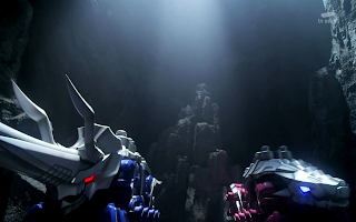 One theme song later, the 3 Ryusoulgers are led to a cavern by Tyramigo where pink and blue's Kishiryuus (zords) are located. It is implied that Koh can understand his mech's roars. Sure enough, they are here and are given names; the pink one is Ankyrose (also translated as Ankyloze) but Melto has trouble bonding with his Kishiryuu and doesn't name it yet. Wanna guess how that sub story will conclude?