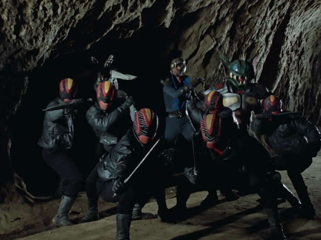A few maniacal laughs later, Hunter Killer orders Goat Monster to spew all over Gavan. Trapped, Gavan does what any normal TV show does when pressed for time; he acts completely unfazed by the dangerous spit and jumps out of the trap hole mid transformation. He defeats Goat Monster and the Doublemen who kidnapped Makoto. Oh yeah, the actual reason for the hidden base inside Tochigi mountain was to house an earthquake machine to terrorize Japan. Gavan blows it up in the first 5 seconds of the fight between Goat Monster and the Doublemen.