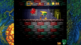 Dorke starts off with an incredible fifty lives!  This is a lot and you'll need every single one of them in order to survive.  This is also not a small game that can be beaten in an hour.  There are around forty levels spread across several different worlds.  This is insane considering it was a game meant for the Super Nintendo.  The game itself wasn't designed to have a save feature, but it does use passwords.  Thank goodness that the custom emulator that this game used has a save state feature.  The custom emulator also has a few graphics options and there's nice artwork that pops up on the sides of the game while running in fullscreen mode.